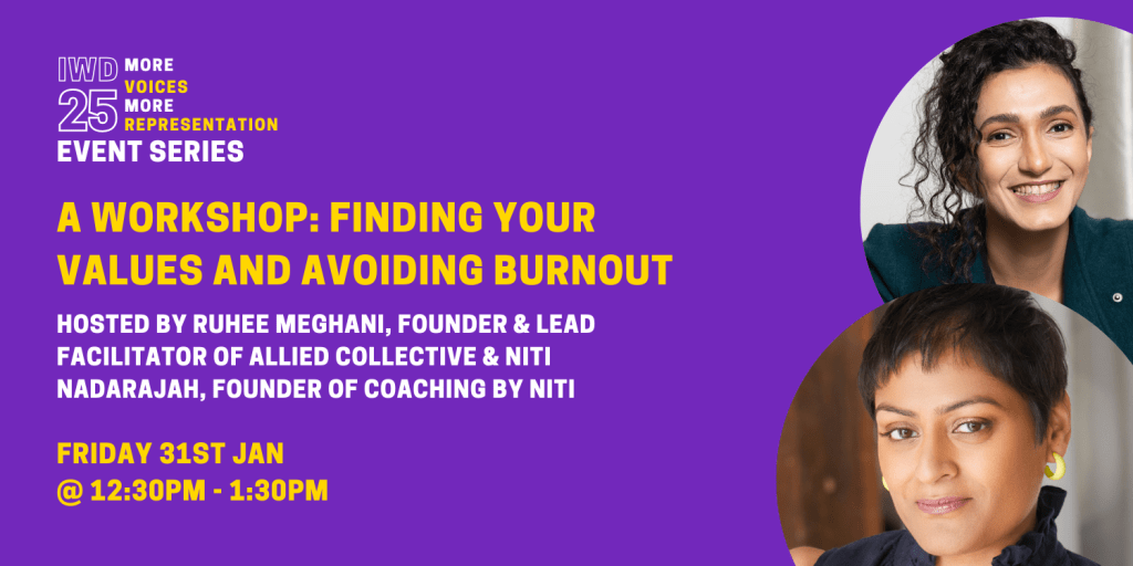 In collaboration with the More Voices, More Representation on International Women’s Day campaign, designed to elevate intersectional, underrepresented voices on IWD, Ruhee Meghani and Niti Nadarajah are co-hosting an exclusive, free webinar about enhancing personal boundaries and ways to prevent burnout.
